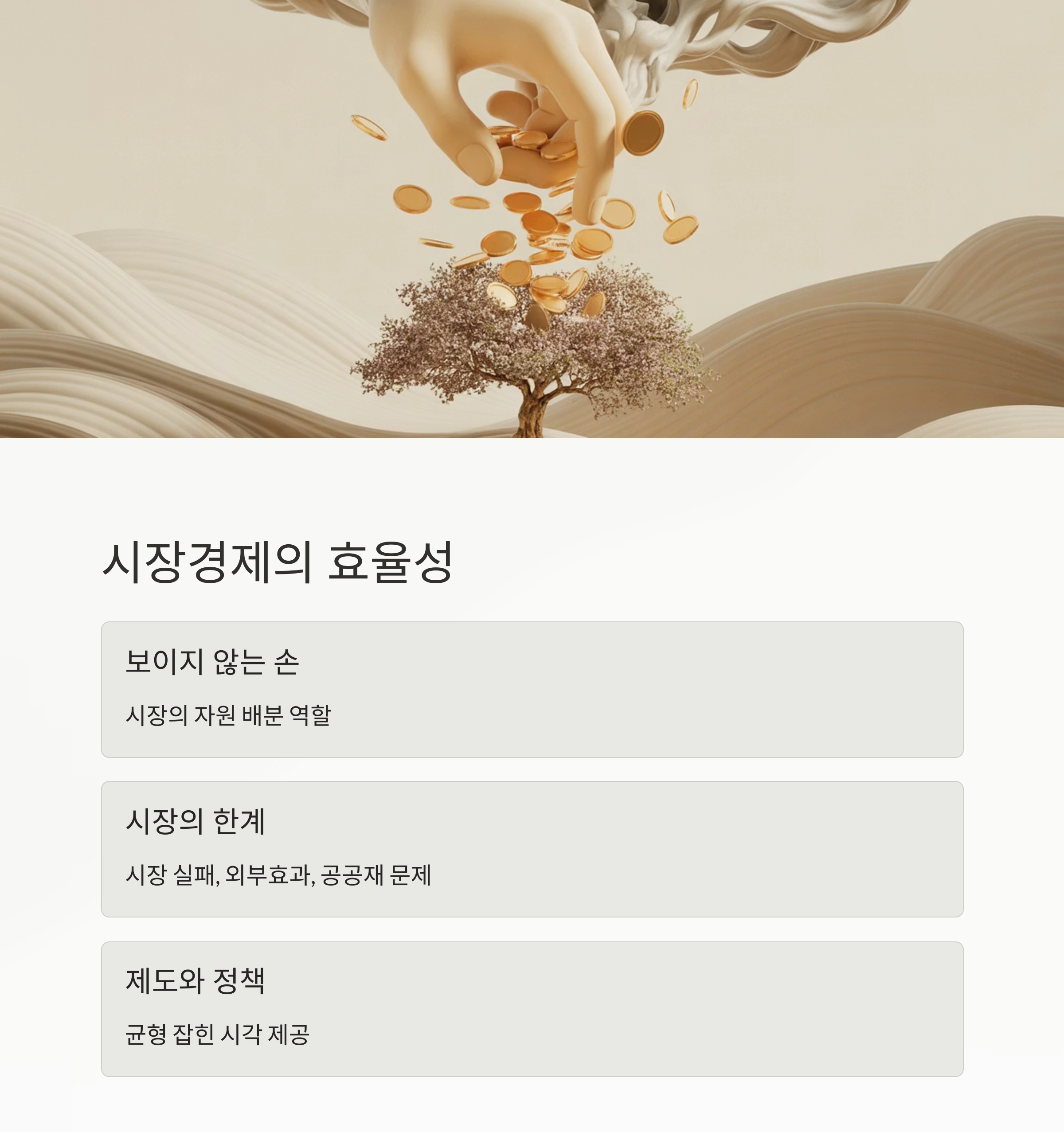 | 시장은 항상 효율적인가요? | 일반적으로는 그렇지만, 외부효과나 정보 비대칭 등이 존재할 경우 정부의 개입이 필요합니다. |