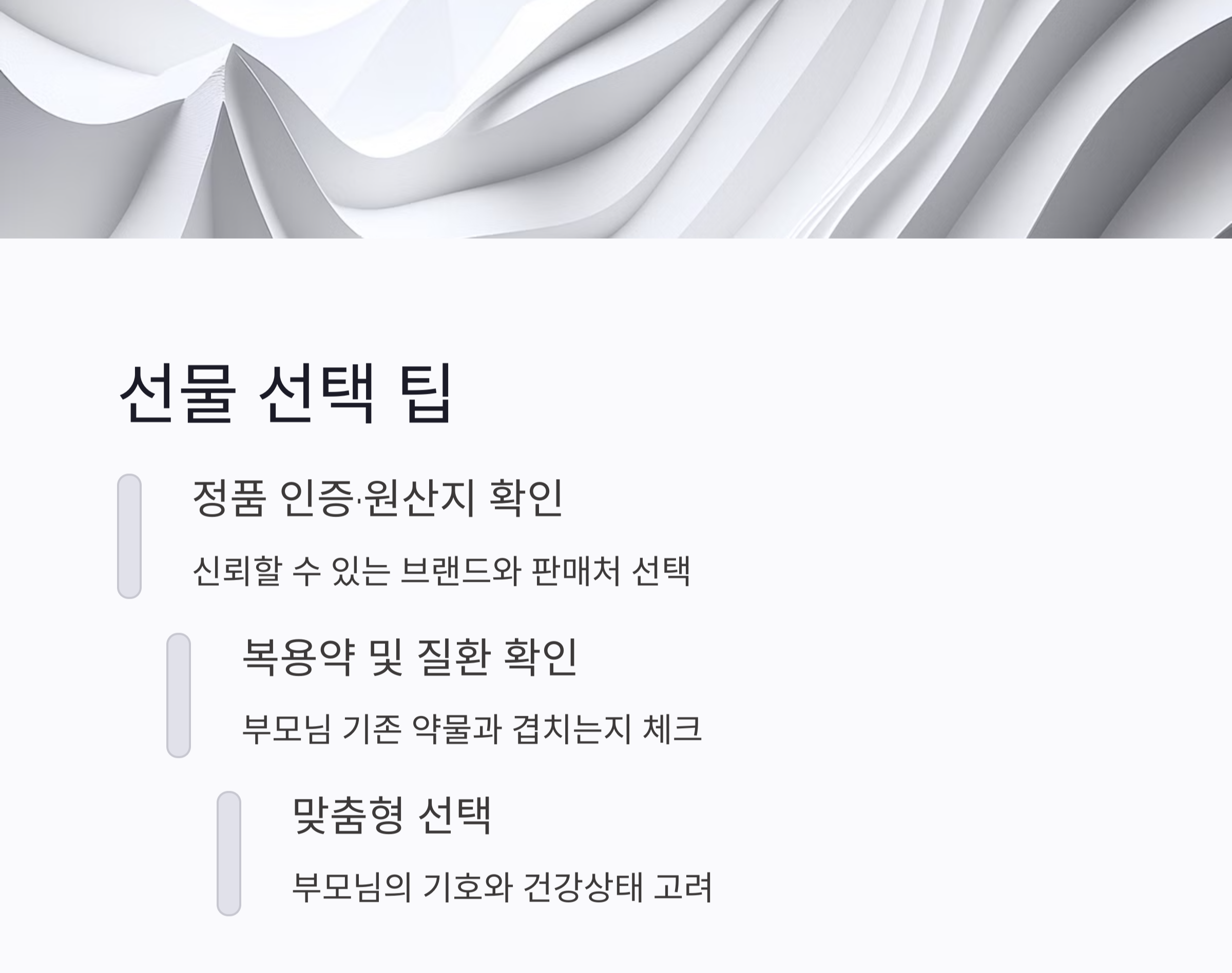 또한, 매일 섭취하는 제품인 만큼 거부감 없이 즐길 수 있도록 부모님의 취향을 고려한 세심한 선택이 필요합니다.