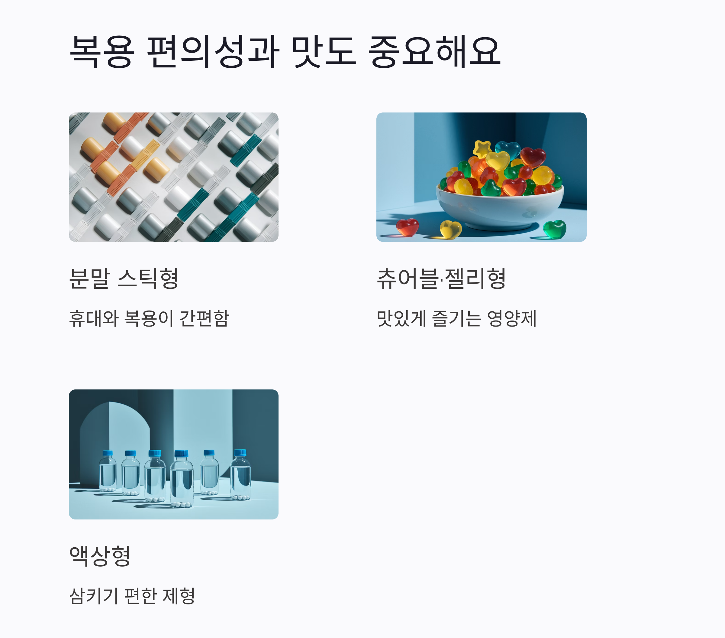 제품을 고를 때는 복용의 편의성과 맛을 꼭 고려하세요.