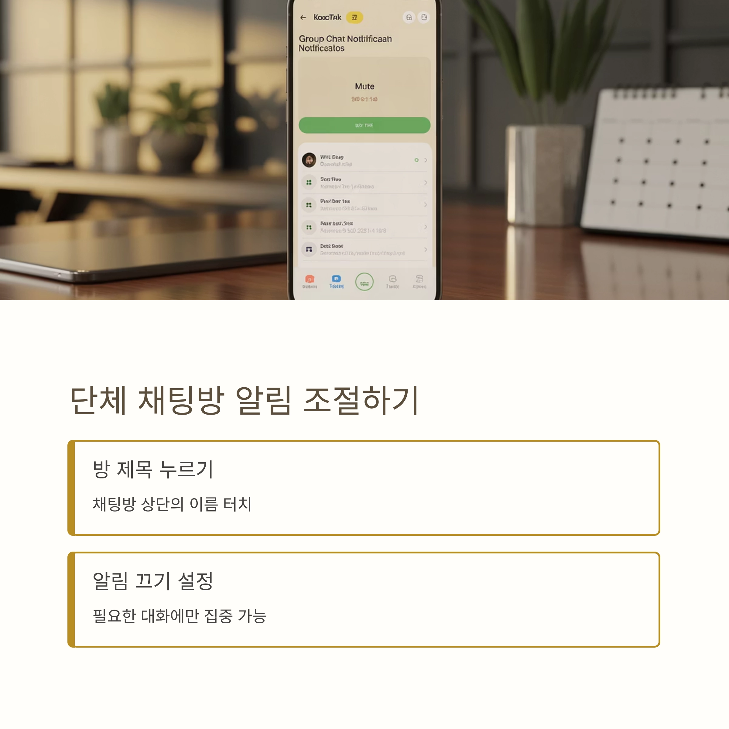 여러 단체방에서 알림이 계속 울리면 번거롭습니다. 방 제목을 누른 뒤 알림 끄기 옵션을 설정하면 필요한 대화만 집중할 수 있습니다.