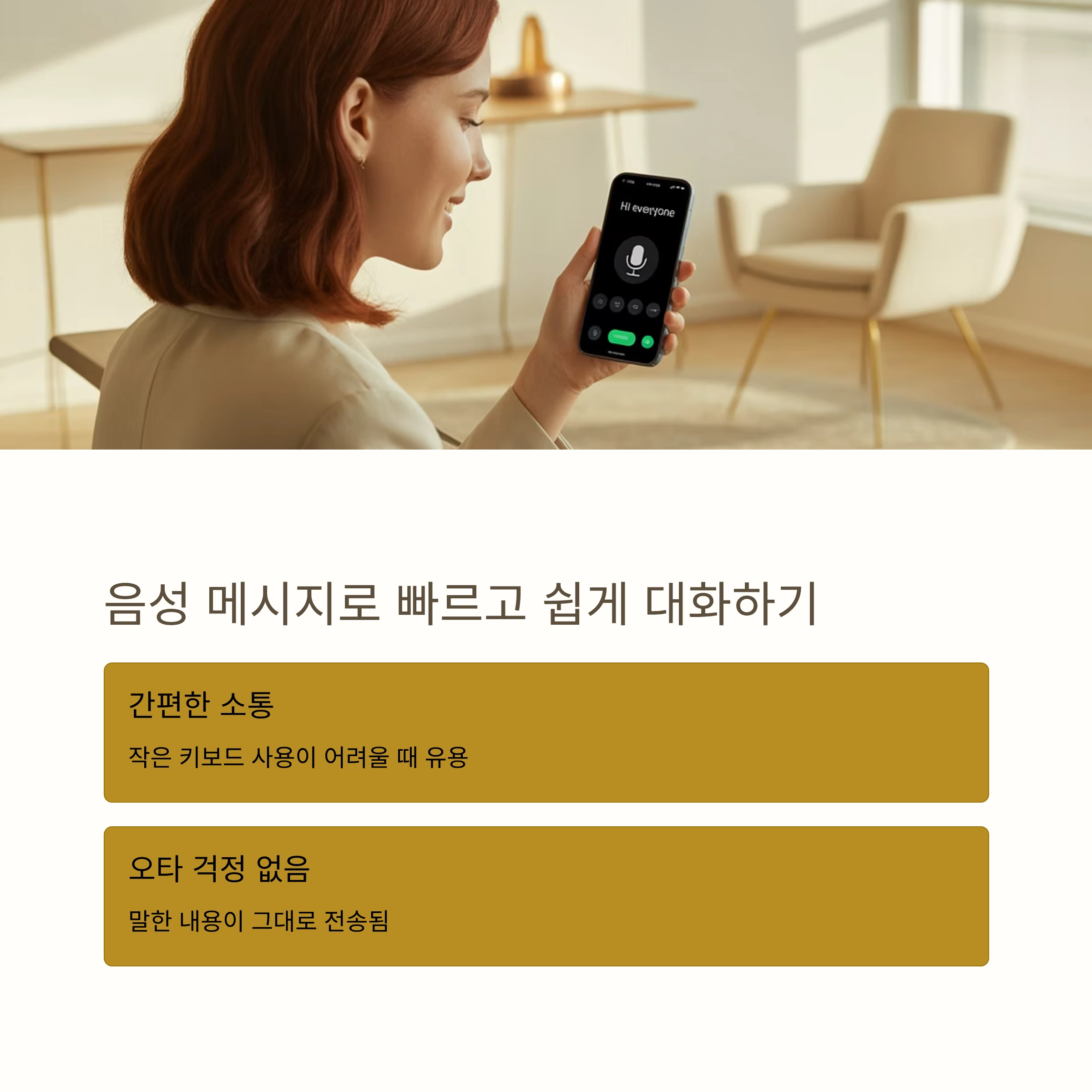 손이 느리거나 작은 키보드 사용이 어려운 분들은 음성 메시지 기능을 활용하면 좋습니다. 말한 내용이 그대로 전송되기 때문에 오타 걱정 없이 대화를 나눌 수 있습니다.
