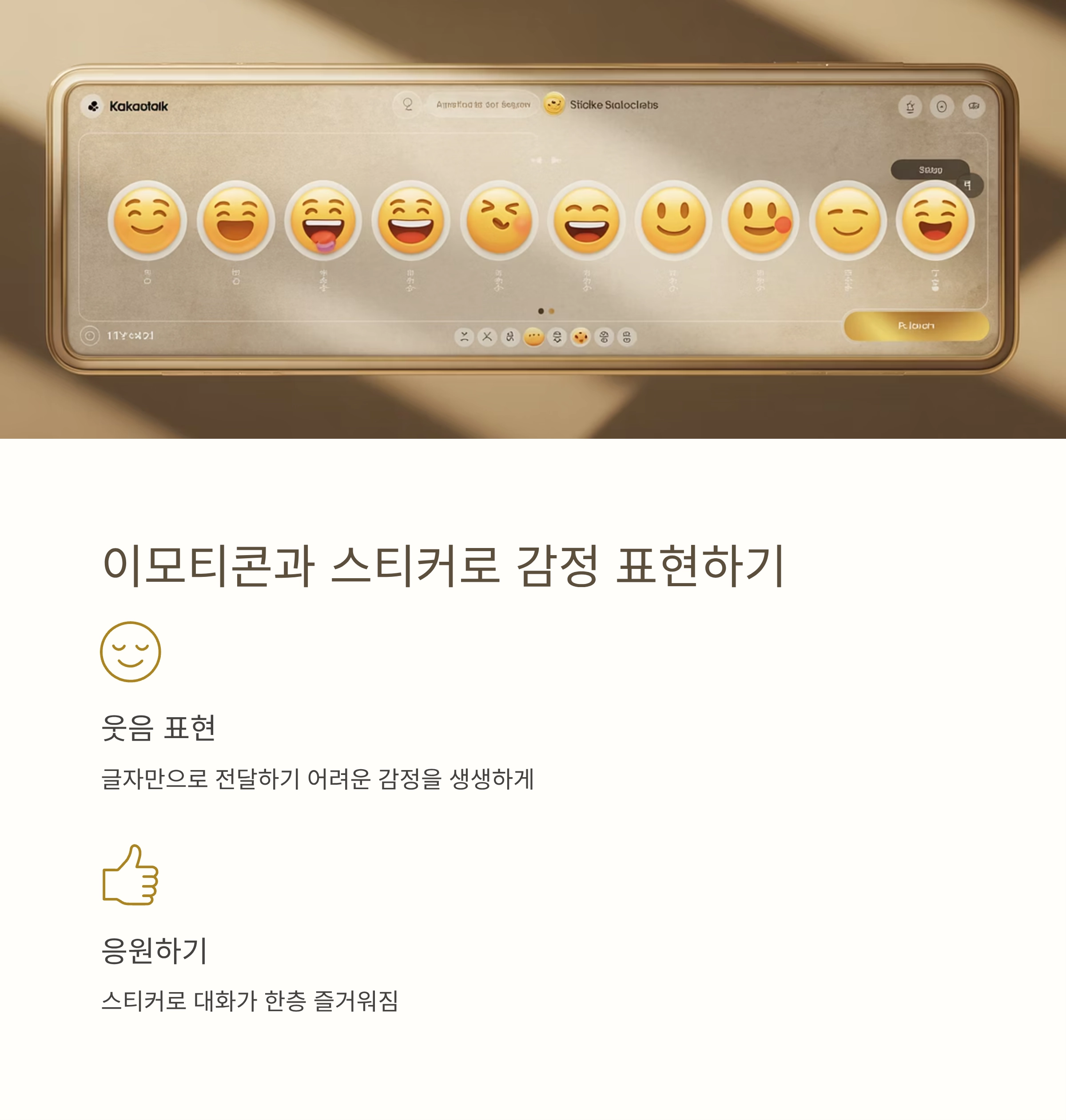 글자만으로 전달하기 어려운 감정을 이모티콘과 스티커로 표현하면 대화가 한층 즐거워집니다. 특히 웃음, 응원, 감사 표현에 효과적입니다.