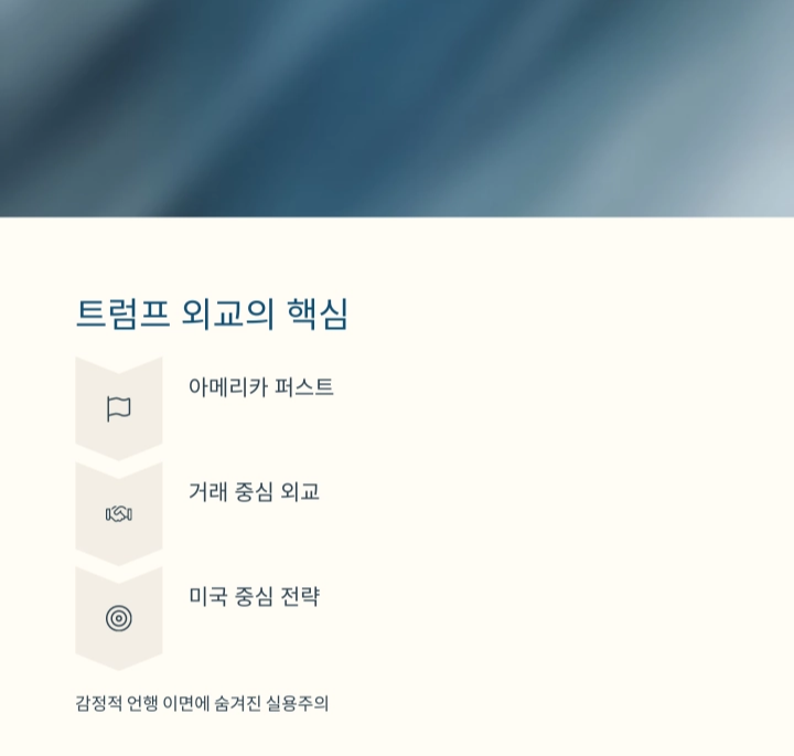| 트럼프 외교 전략 | 기존 질서와 다른 방식의 거래 중심 외교 운영 |