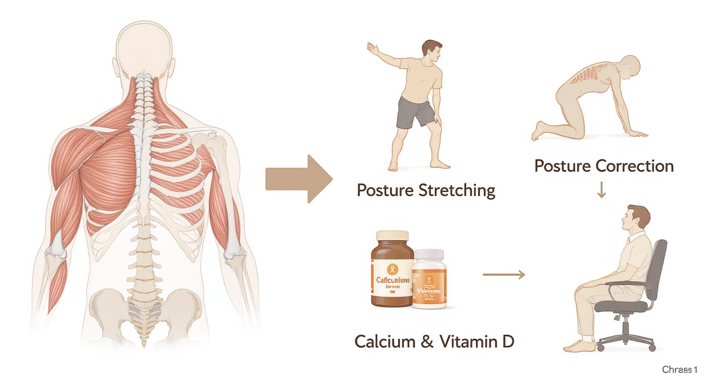 꾸준한 스트레칭, 자세 교정 운동, 칼슘과 비타민D 섭취가 중요합니다. 의자에 앉을 때 허리 각도 유지, 장시간 한 자세 금지 등이 실천 포인트입니다.